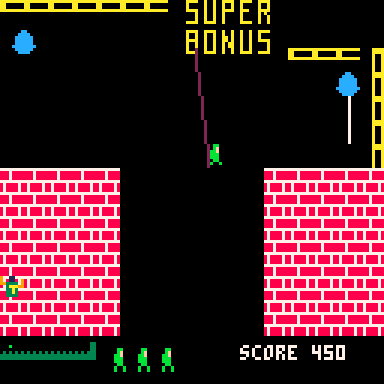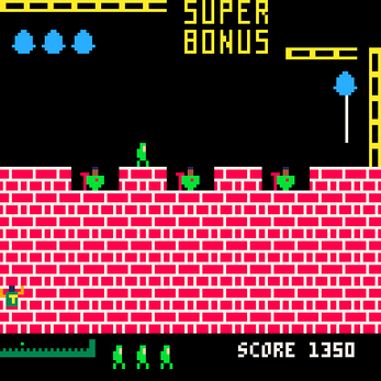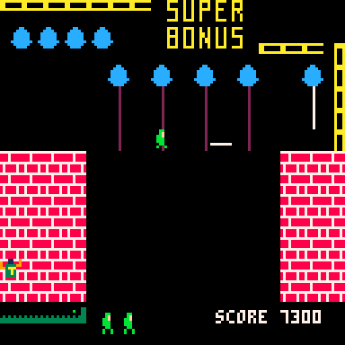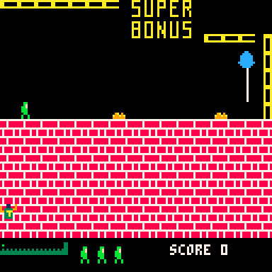 Play as Quasimodo, the hunchback of Notre Dame, and brave a series of perilous castle walls in your quest to rescue the fair Esmeralda. Leap over pits, dodge arrows, and time your swings across ropes as you sprint from danger to danger in this fast-paced, one-screen-at-a-time platformer.
